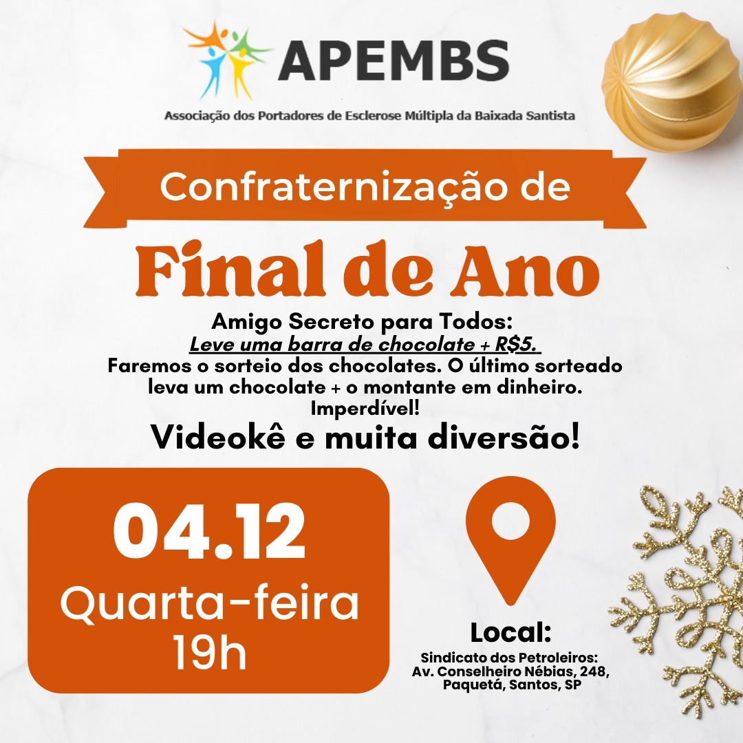 A nossa confraternização de Final de Ano está imperdível! Participe! admin2025-04-15T10:09:26-03:00 A nossa confraternização de Final de Ano está imperdível! Participe! #santos #zerotreze #santoscidade #esclerosemultipla #confra Compartilhar este post Facebook Twitter LinkedIn Google + E-mail
